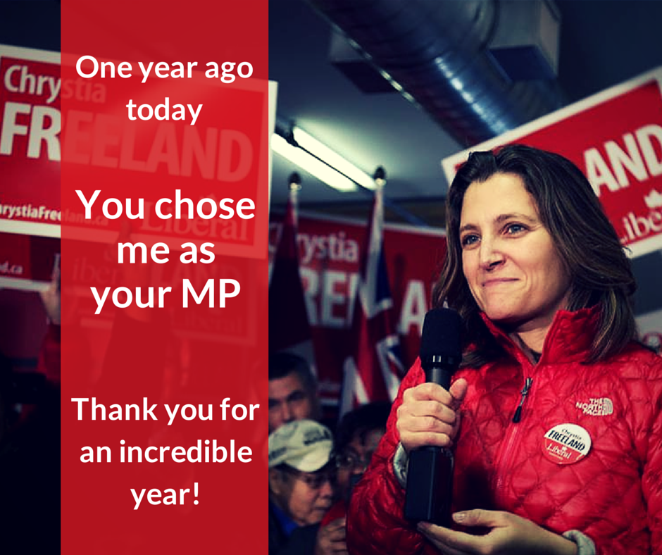 @cafreeland I live in Calgary but I'm very happy that you are part of the Liberal team and that you won last year. Happy Anniversary!Thanks. Twitter will use this to make your timeline better. UndoUndo