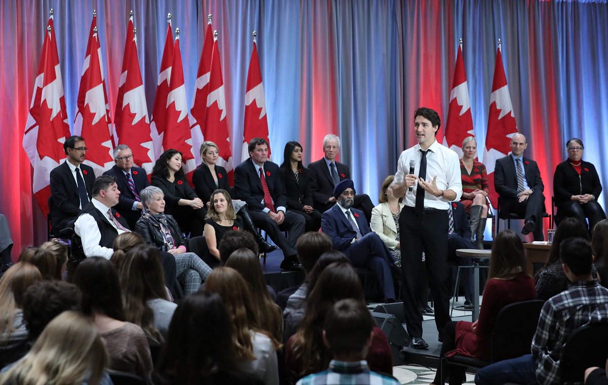 PM Trudeau and members of his Cabinet mark the government's one-year anniversary by participating in a town hall with high school students. pic.twitter.com/uLSChlSE5H