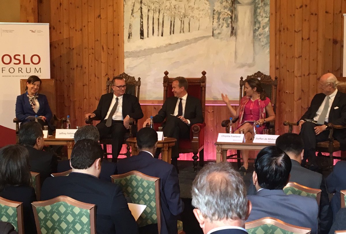 Panel on @UN, politics & peacemaking with #UN #Syria Envoy De Mistura, @UN_DPA chief Jeffrey Feltman & #Norway MFA @borgebrende #OsloForumpic.twitter.com/rsnDFruPCc