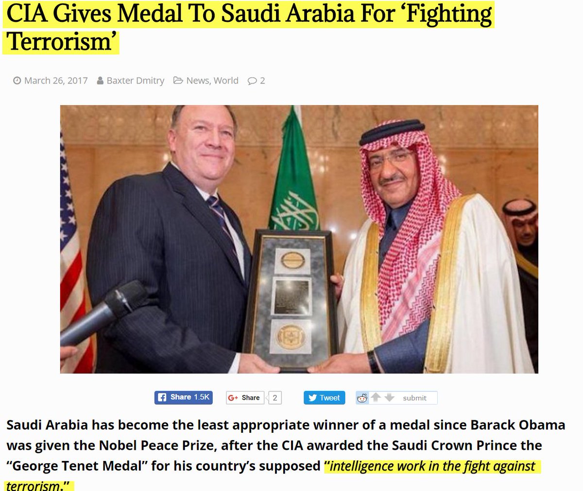 Really, efforts internationally are underway to try and remove Saudi Arabia seat on the UN's Human Rights Council. So what does Pompeo do, he gives the Saudis an award for FIGHTING TERRORISM when the Saudis have always had their fingers in the terrorist pie!pic.twitter.com/xlf8UQ7FKK