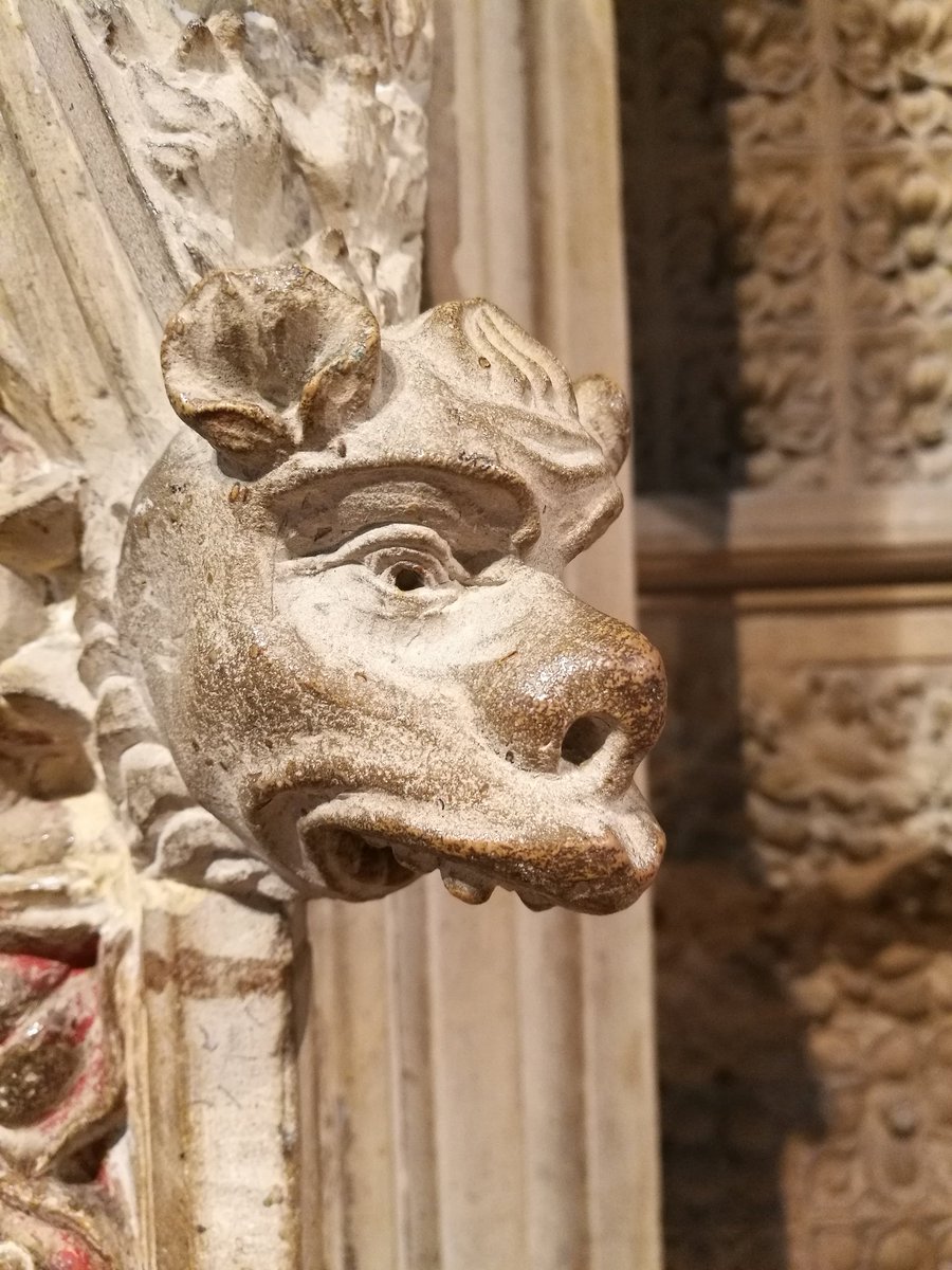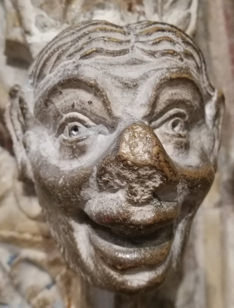 A face and traces of colour on the 14th-century carved stone choir screen of Lincoln Cathedral.pic.twitter.com/LpB9jfebHE