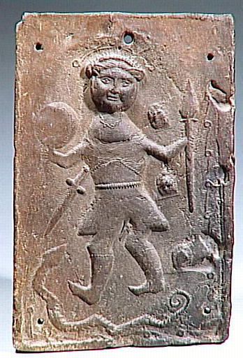 this one tramples a snake/devil holds the spear has a sword holds a ? looking at @Archeonationale do you have any idea?pic.twitter.com/mcSFv3rvMa