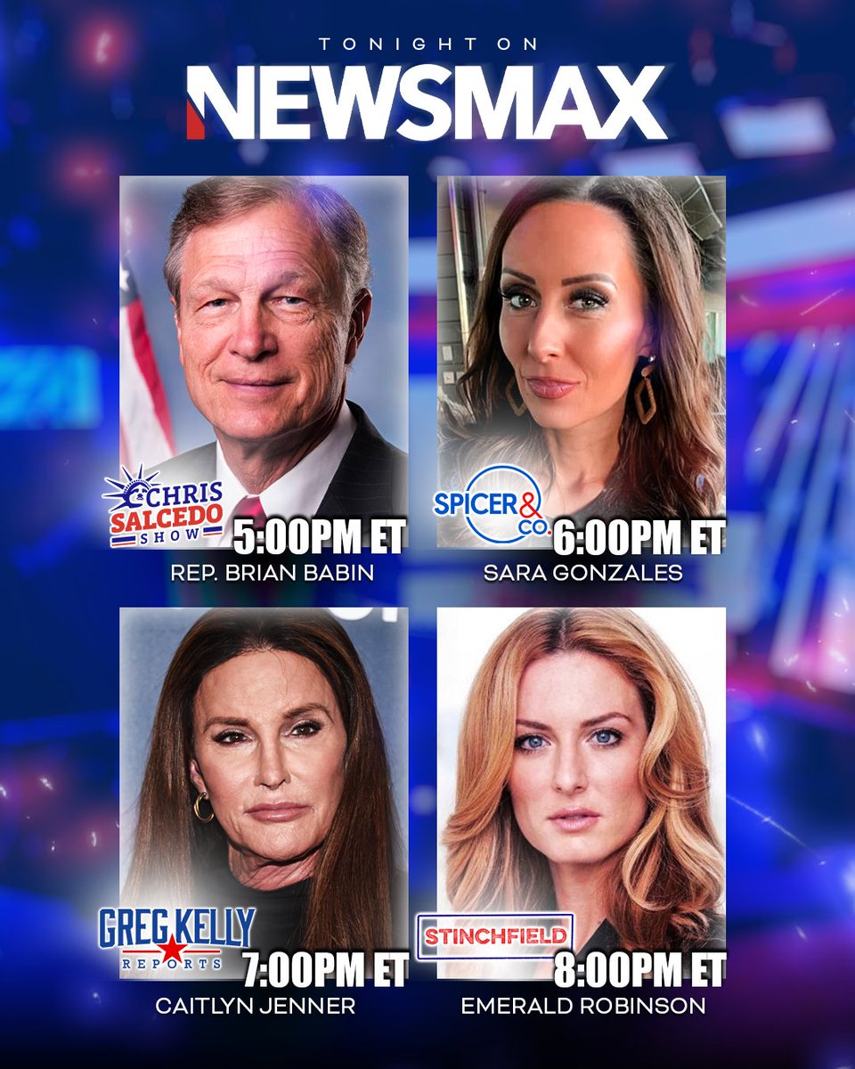 • 5:00PM ET: @RepBrianBabin • 6:00:@SaraGonzalesTX • 7:00:@Caitlyn_Jenner • 8:00:@EmeraldRobinson WATCH LIVE on Newsmax: http://nws.mx/tv pic.twitter.com/900sO9JFFR