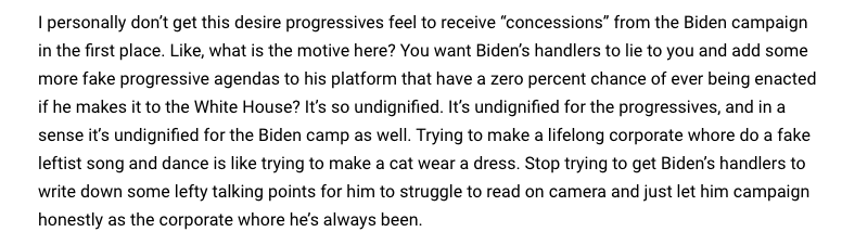 You're being unfair to yourselves, and in a sense you're being unfair to the alt-centrists too. Trying to make a right wing corporate whore pretend to be a leftist is like trying to make a cat wear a dress. Just let them be honest about themselves.https://twitter.com/caitoz/status/1251681755284697088?s=20 …