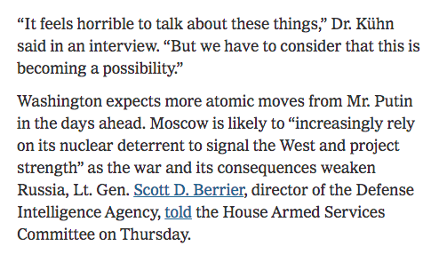 A sane species would look at paragraphs like these and say "Oh so obviously we need to de-escalate and move toward detente immediately." Instead the US empire is ramping up escalations and refusing to negotiate or compromise. https://twitter.com/nytimes/status/1506095895577870341 …pic.twitter.com/h9WcTqjoLG