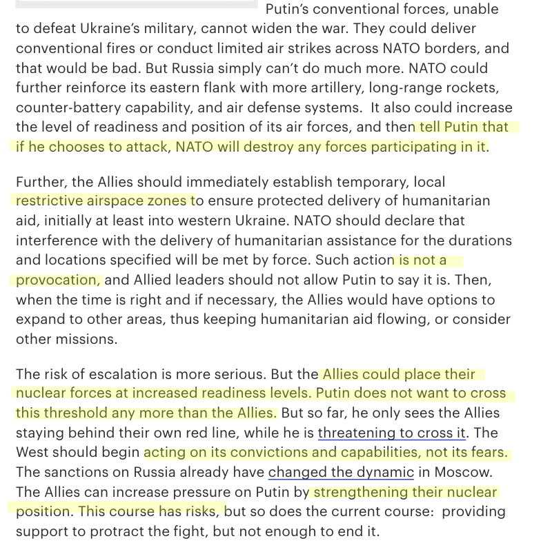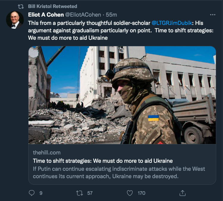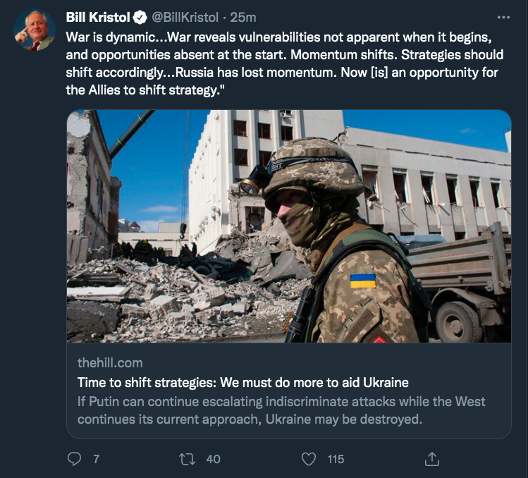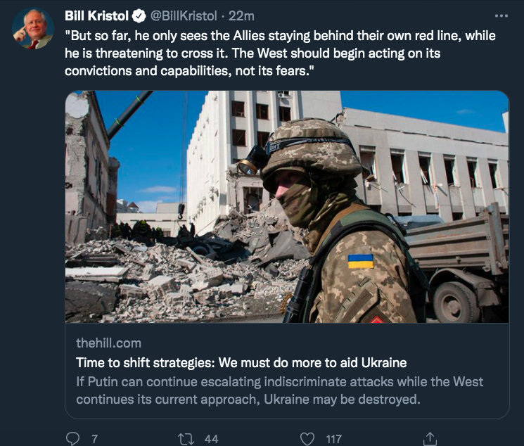 @BillKristol has shared this article three separate times calling for direct military action against Russia from "the Allies", arguing that doing so might not provoke a nuclear war. https://thehill.com/opinion/national-security/598908-time-to-shift-strategies-we-must-do-more-to-aid-ukraine …pic.twitter.com/LVTDffMUVV