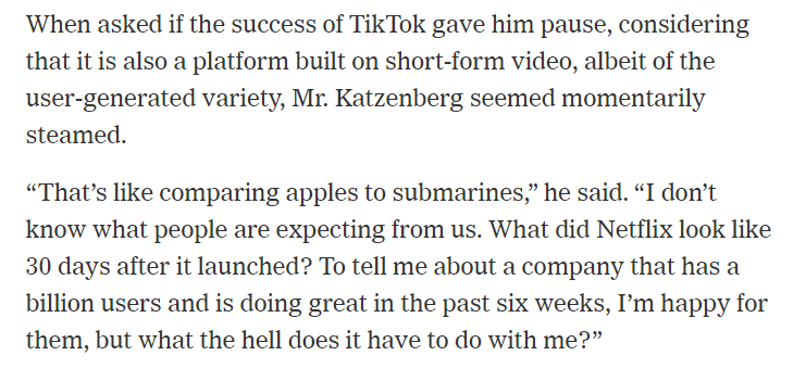 Putting it out there that I can never consume enough content about Quibi. Have not downloaded it. Will not download it. Would love to watch a 14-hour Netflix docuseries deep diving into every single aspect of it.https://www.nytimes.com/2020/05/11/business/media/jeffrey-katzenberg-quibi-coronavirus.html …