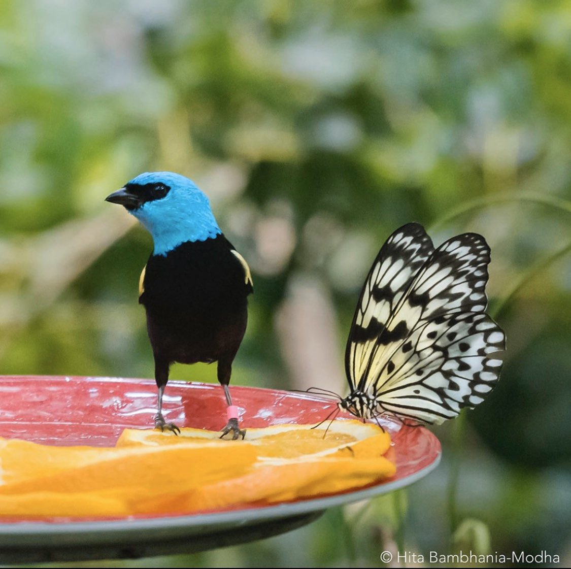 Breakfast w/friends. And for the softies out there: Although insects are part of a blue-necked tanager’s diet, “most of our butterflies are poisonous & bad-tasting,” says biologist Tim Wong, “so these 2 beauties have no problem sharing a meal.” /