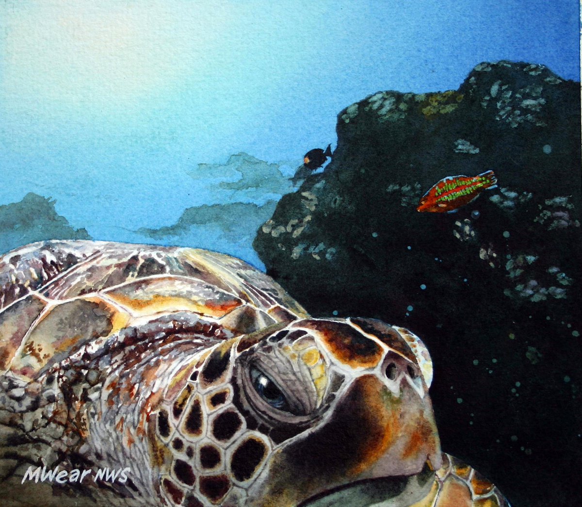 Image: Marilyn Wear, "Honu with Christmas Wrasse, Maui," Watercolor on Arches, 6" x 7"