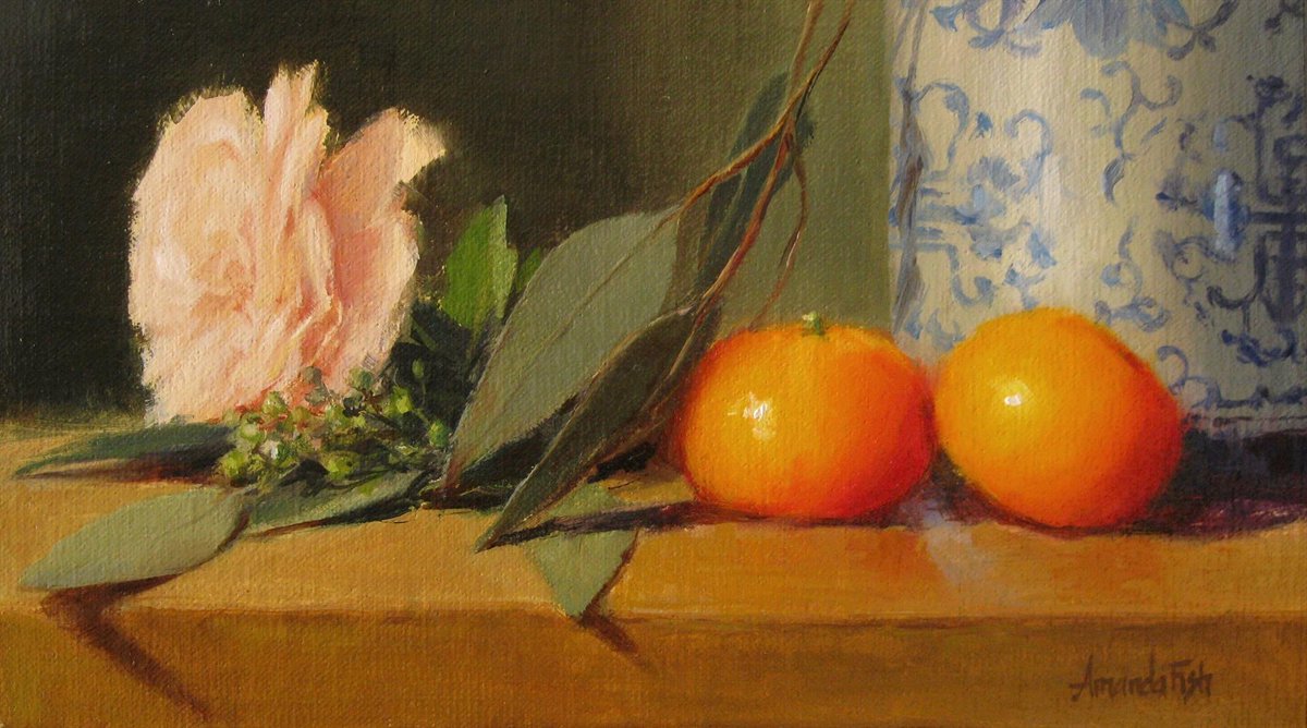 Image: Amanda Fish, "Eucalyptus with Mandarins and Rose," Oil, 6" x 10.5"