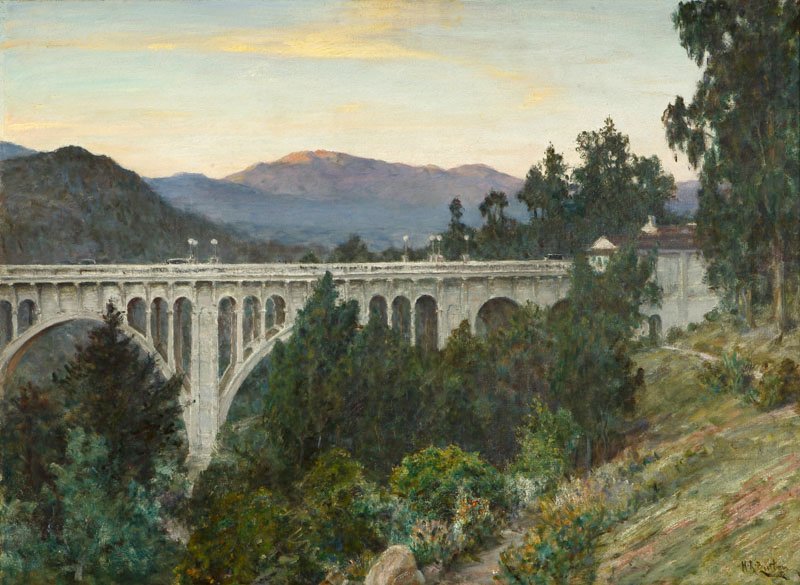 H L Richter - View of the Colorado Street Bridge, the Arroyo Seco and the San Gabriel Mountains at sunset, Pasadenapic.twitter.com/VGIG86vNEF