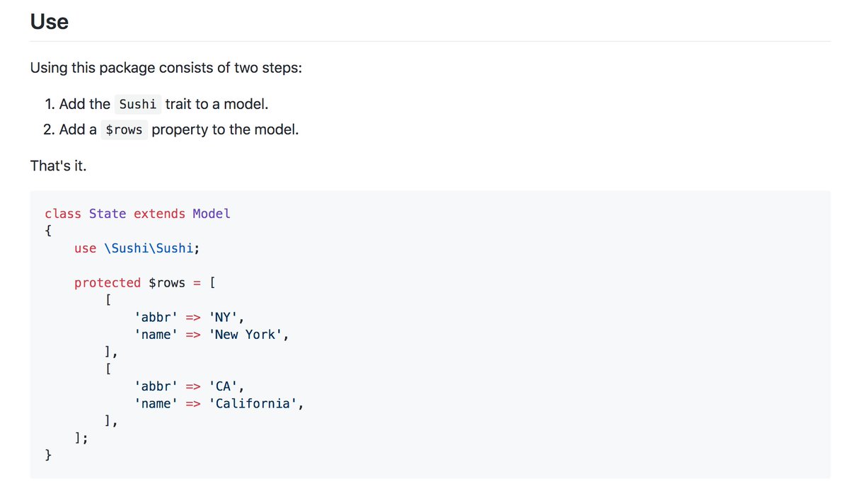 Also, someone already PR'd an example model that you can copy and paste into your project. I think a cool unintended side-benefit of this package will be a suite of common fixture models: States, Countries, Zip Codes, who knows what else - pretty useful for me.pic.twitter.com/IVz0cWTZI8