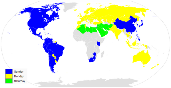 First Week Day in Different Nations pic.twitter.com/4JV1L8x7Fj via @Amazing_Maps (Grey: No data on existence, length or start of week)