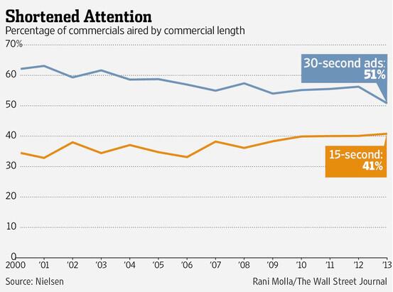 RT @ValaAfshar: 30-second ad spot losing ground to shorter, 15-second commercials http://on.wsj.com/1k0ROtR pic.twitter.com/e0lYFfY507