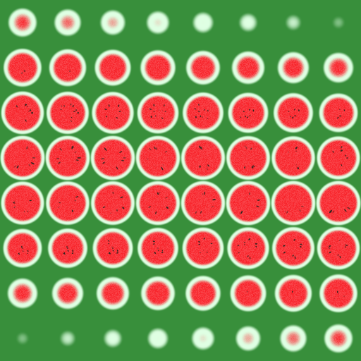 I made a tool using Unity where I can create various types of signed distance field objects and specify their positions, sizes and colours. For example, each watermelon seed is an ellipsoid SDF. The tool then generates a texture from them.