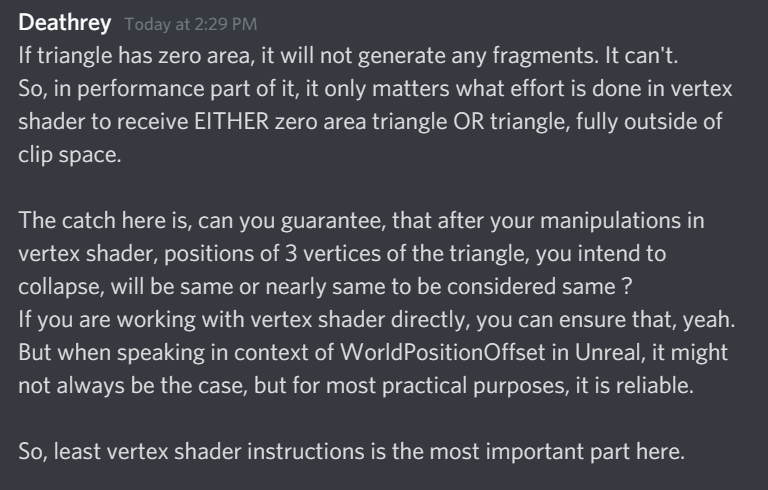 Yeah, that's not in question - but afaik some platforms deal better with degenerates than others, so moving the collapsed verts outside of the camera frustum instead of leaving them in view but 0 size is supposedly safer. Which is what I haven't gotten around to testing yet :-)