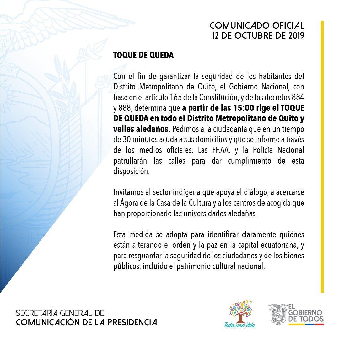 COMUNICADO OFICIAL | El Gobierno Nacional con base en el artículo 165 de la Constitución, y de los decretos 884 y 888, determina que a partir de las 15:00 rige el TOQUE DE QUEDA en todo el Distrito Metropolitano de Quito y valles aledaños. #LaPazSeRecupera #ApoyoALaDemocracia pic.twitter.com/m3bWQYxYcB