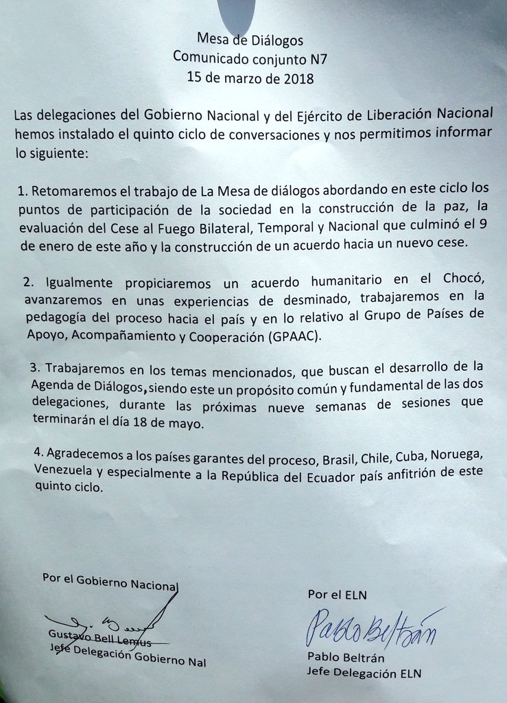 Joint communique. The ELN (@ELN_Paz) and Colombia's government @EquipoPazGob sign a statement today at start of fifth cycle of dialogue taking place today in Quito, Ecuador.https://twitter.com/CSalas_teleSUR/status/974361082142879752 …