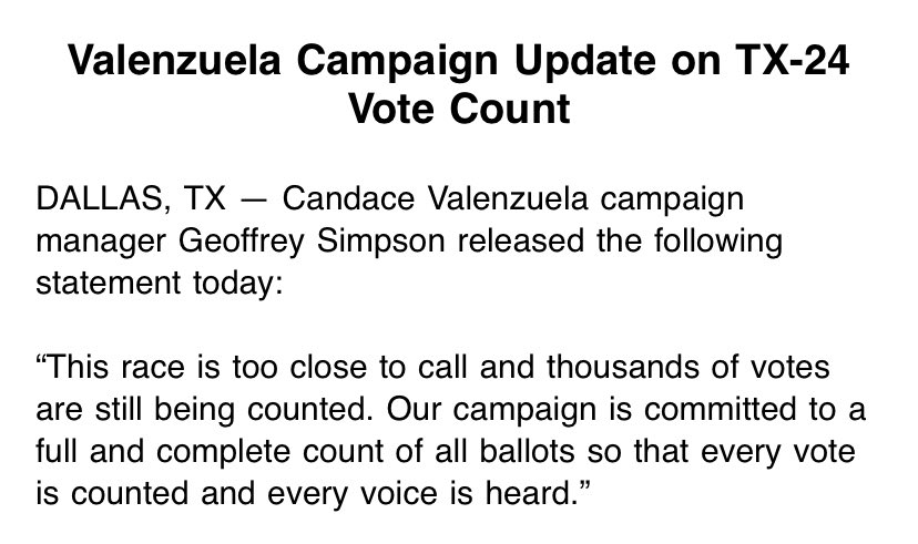 Valenzuela Campaign Update on TX-24 Vote Count:pic.twitter.com/jdu5asVgKN