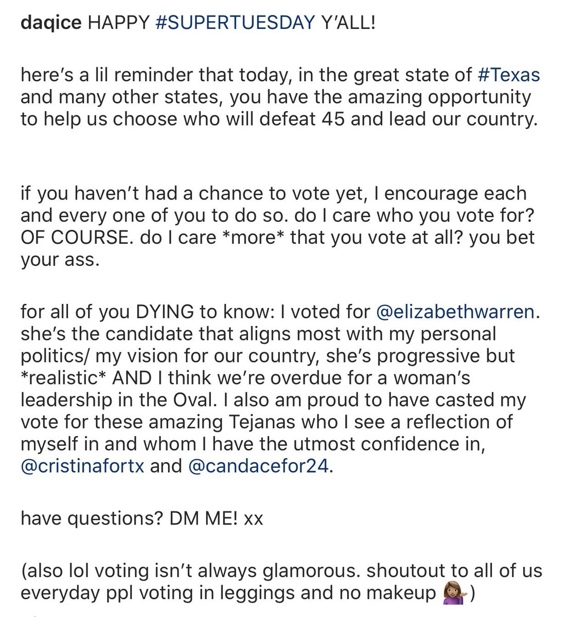 It’s #SuperTuesday— did you vote yet? I voted for @ewarren @cristinafortx and @candacefor24.
