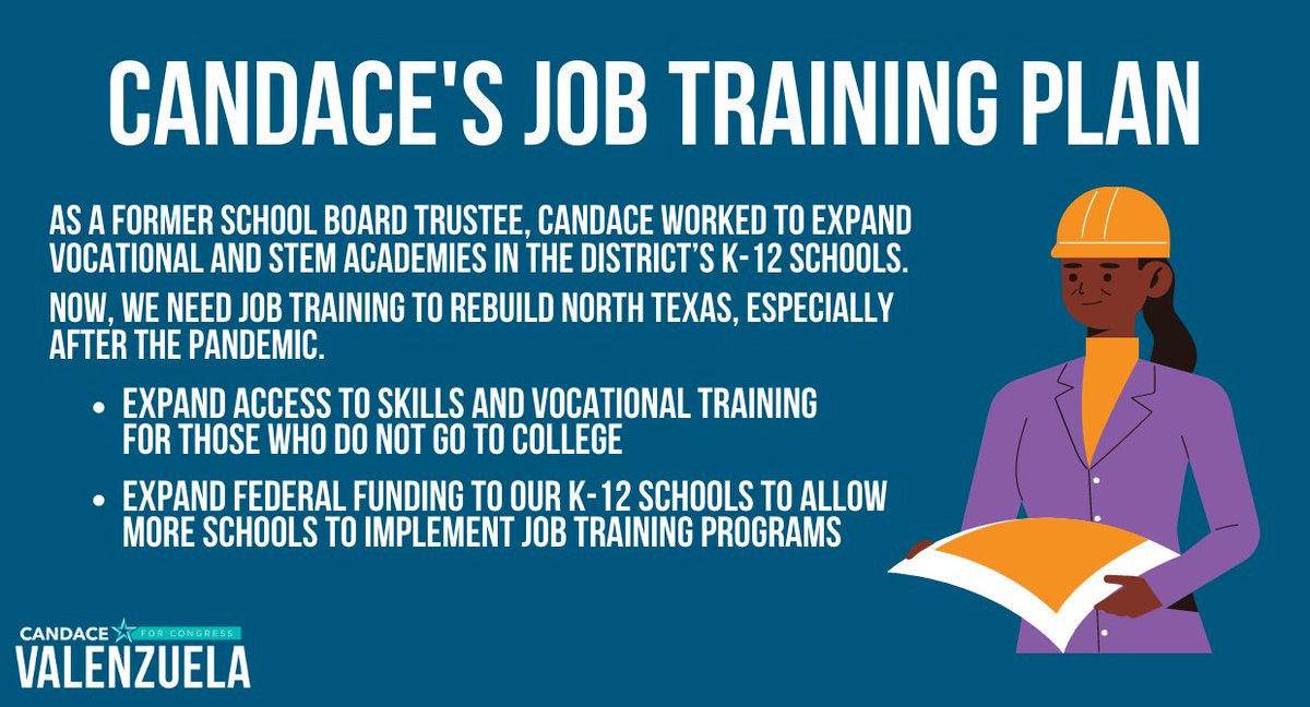While I was on the School Board, I expanded skills training and apprenticeship programs. In Congress, I’ll make sure that training leads to dignified, well-paid jobs that are integral to rebuilding North Texas. http://candacefor24.com pic.twitter.com/r9o6Lvsxd5