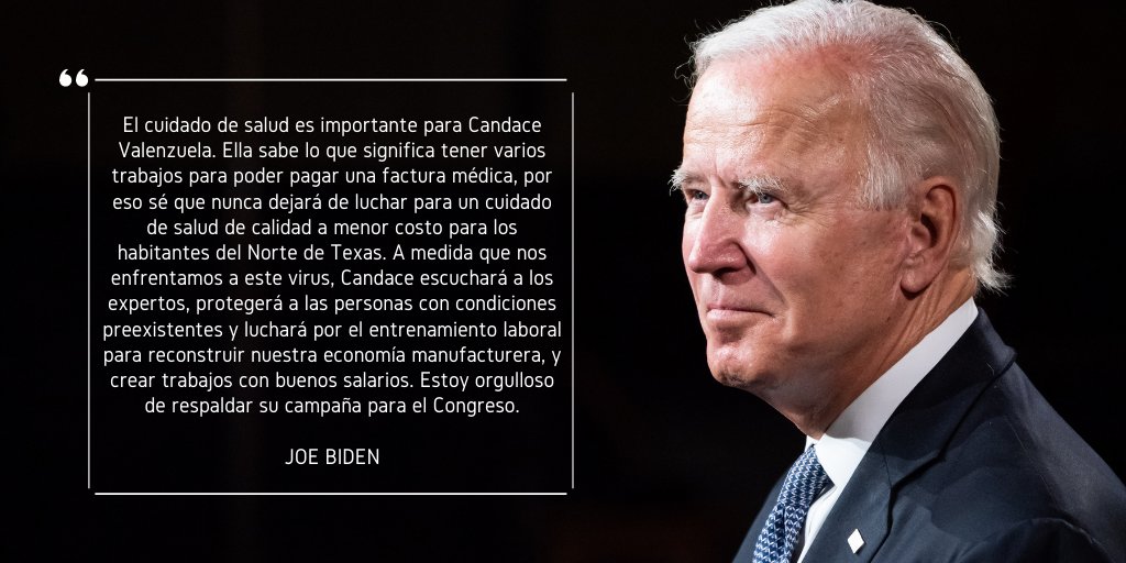 Joe y yo pondremos a las familias trabajadoras primero, escuchando a los expertos, ampliando el acceso a atención médica, deteniendo la propagación del virus y haciendo que los habitantes del Norte de Texas vuelvan a trabajar de manera segura.pic.twitter.com/IQpb3G5eLn