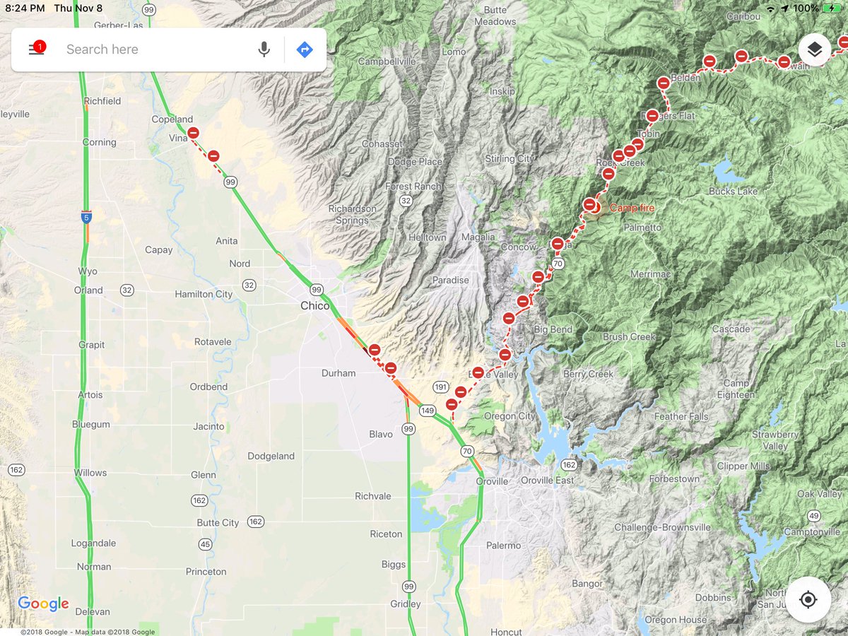 Yikes #CampFire must have jumped 99. Road closed South out of Chico for nowpic.twitter.com/GT4mGp6qug