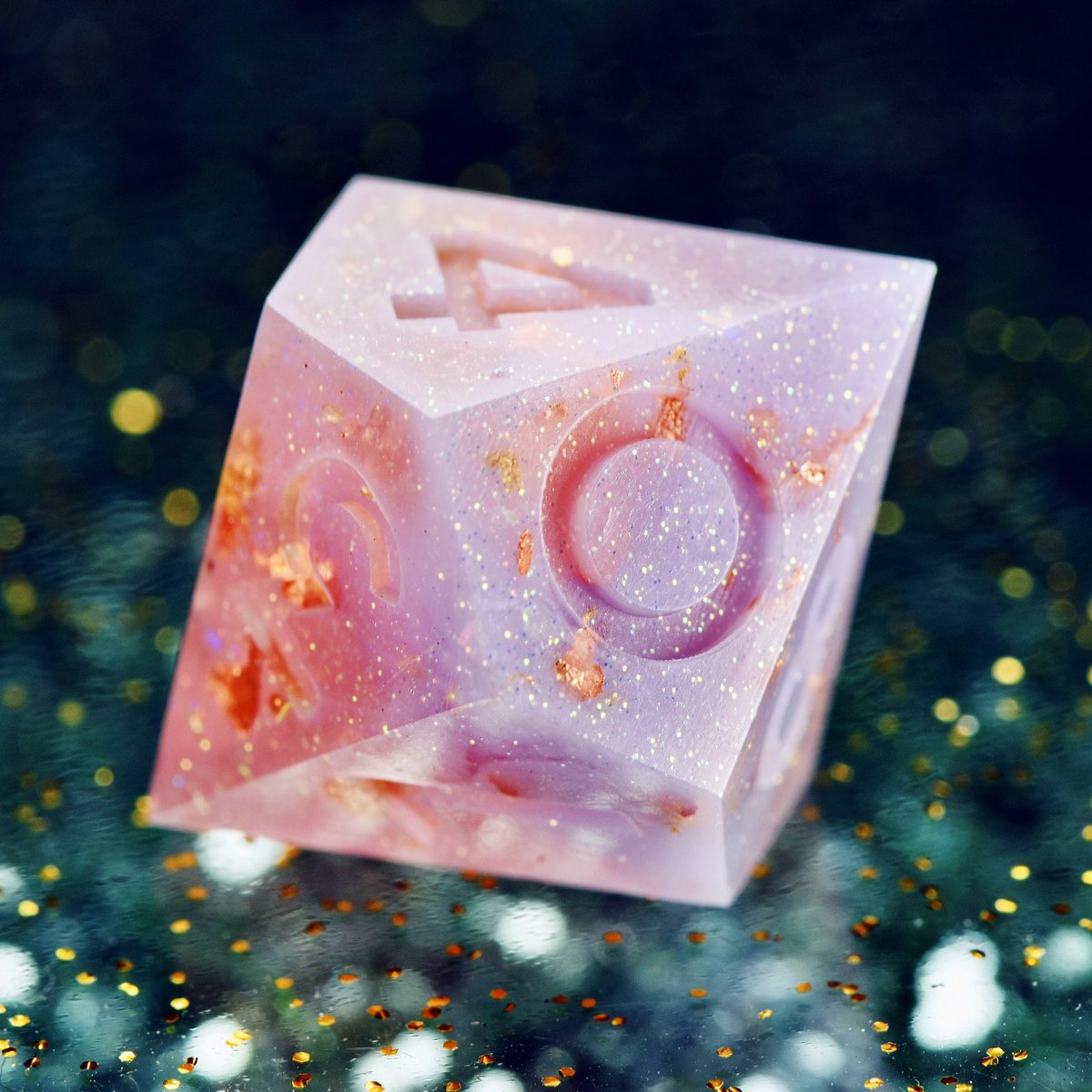 Gold and copper foil swirling inside of a milky pastel lavender and translucent coral tempest. I love how it gradients into a soft pink when they kiss.