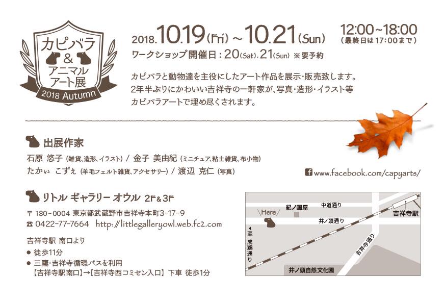 来月19(金)20(土)21(日)、吉祥寺で開催致します「カピバラ&アニマルアート展2018秋」のDM葉書が完成致しました。 カピバラと動物達で、一軒家のギャラリーを埋め尽くします。ぜひ、遊びに来てください。 #カピバラ #水豚 #10月19~21日吉祥寺カピアニ展 #吉祥寺pic.twitter.com/9apTzYGGga
