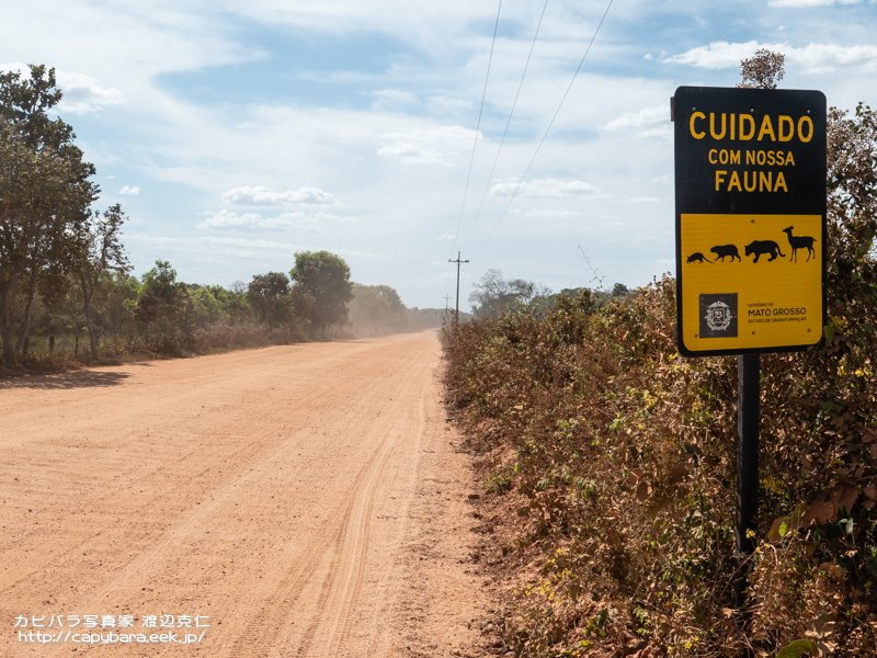 道脇には動物注意!の看板、以前は木製だったのですが綺麗になりました。もちろん、カピバラのイラストも2番目に。