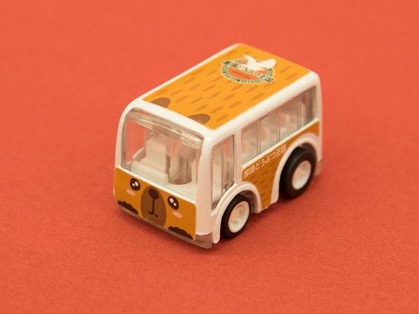 那須どうぶつ王国売店で見つけた、チョロQを原型としたカピバラバス。もちろん本体を地面に押し付け引き、離すと猛スピードで走る。天井には王国のロゴ入りだ。540円。是非、本物の園内を循環しているカピバラバスに乗った方は記念にどうぞ。pic.twitter.com/kgJYty79ev