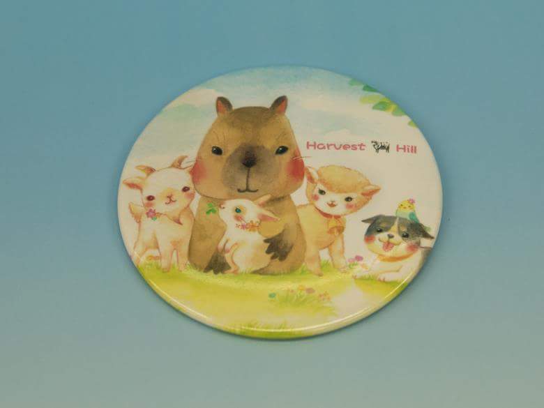 直径10cmの大きな缶バッチ520円。可愛すぎるイラストに一目ぼれ。絵の雰囲気もさることながら、カピバラが中央にいる上に、大事そうにウサギに手を添えているのがイイ!pic.twitter.com/lbppD6zpss
