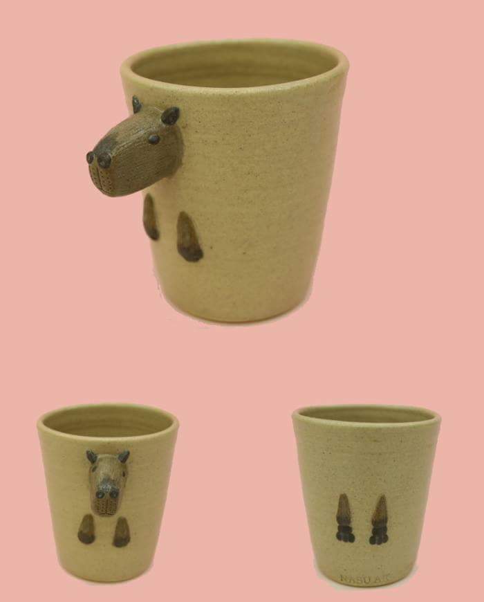 カピバラモチーフの益子焼陶器、2340円。 高さ9.5cm、飲み口径8cm、重さ240gと男性の手だったら、すっぽりと握れる大きさ、重そうですが、そうでもない。飲み口の肌触りは滑らか。正面にはカピバラの頭状の持ち手が付いている、背面は後ろ足だ。那須どうぶつ王国にて購入。pic.twitter.com/dr2O0xPDJQ