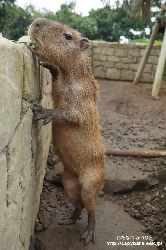 「餌、くださいなぁ」と立ち上がっているカピバラ。立つと意外と大きいんです。幼稚園児の身長ぐらいあります。ちょっとお腹が出てますが、それはご愛嬌ですね♪ 伊豆シャボテン動物公園にて。pic.twitter.com/YxRDk93wdZ