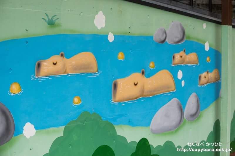 伊豆シャボテン動物公園、講堂の壁画のイラスト、カピバラ露天風呂のまったりした雰囲気が素晴らしいです。pic.twitter.com/RzXfUuUAWa