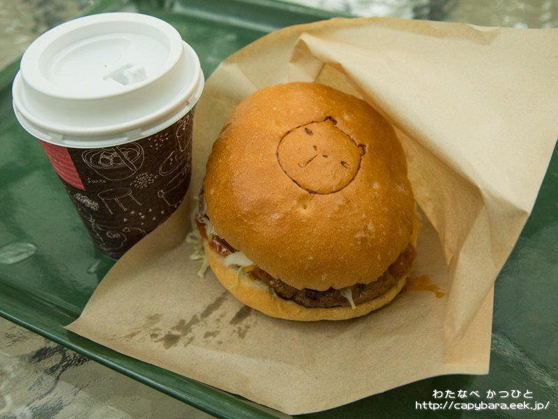 犬猫ふれあい横「バーガーショップ レトリバー」。しっかりとした肉厚のパテがジューシー。何より、パンに刻印されてるイラストが可愛い(勝手にカピバラだと思っています)