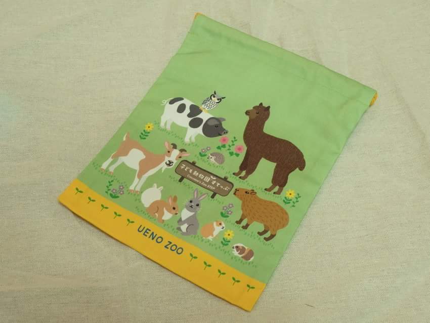 上野動物園の売店で購入した24×19cmの巾着。ついついカピバラが可愛くて手に取ってしまいました。背面はパンダ&モルのイラストと名前を書ける欄が印刷されています。