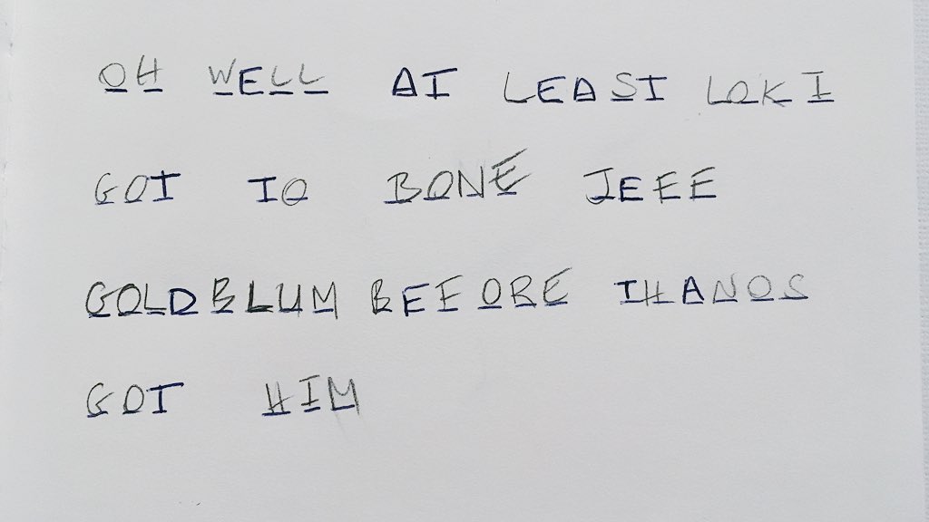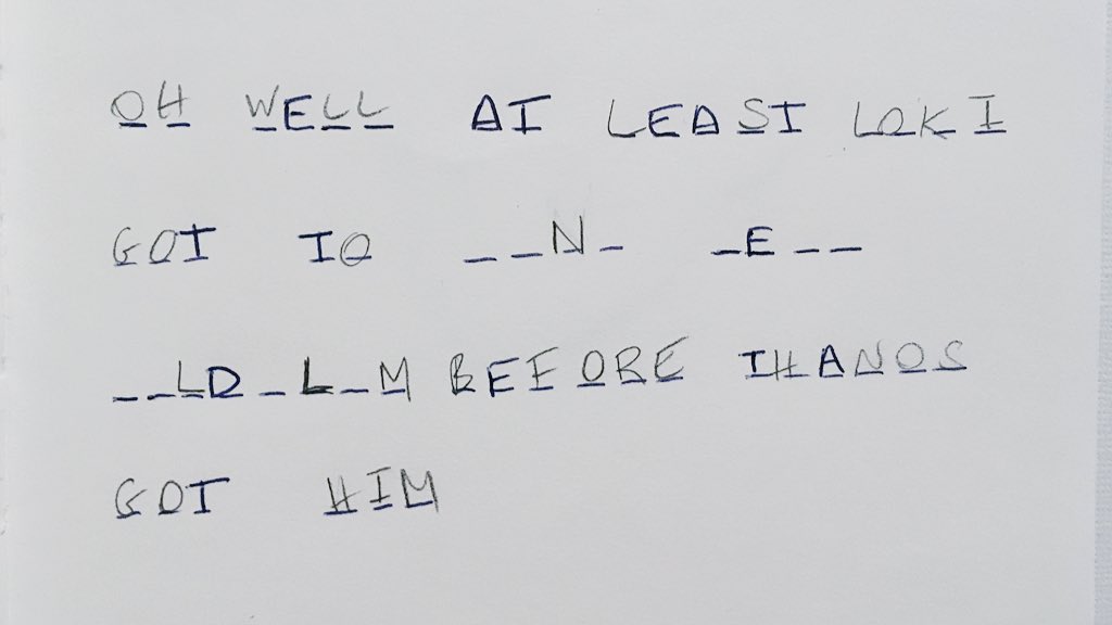 oh *ell at least lo*i *ot to *an* *e** *old*l*m *e*ore thanos *ot him https://twitter.com/LigOFE/status/1019729057422954496?s=19 … (I missed out another a cos I'm AWFUL)