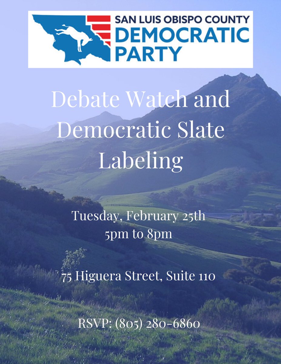 Join @SLODemocrats TONIGHT to watch the debate, enjoy some pizza and help elect local Democrats!