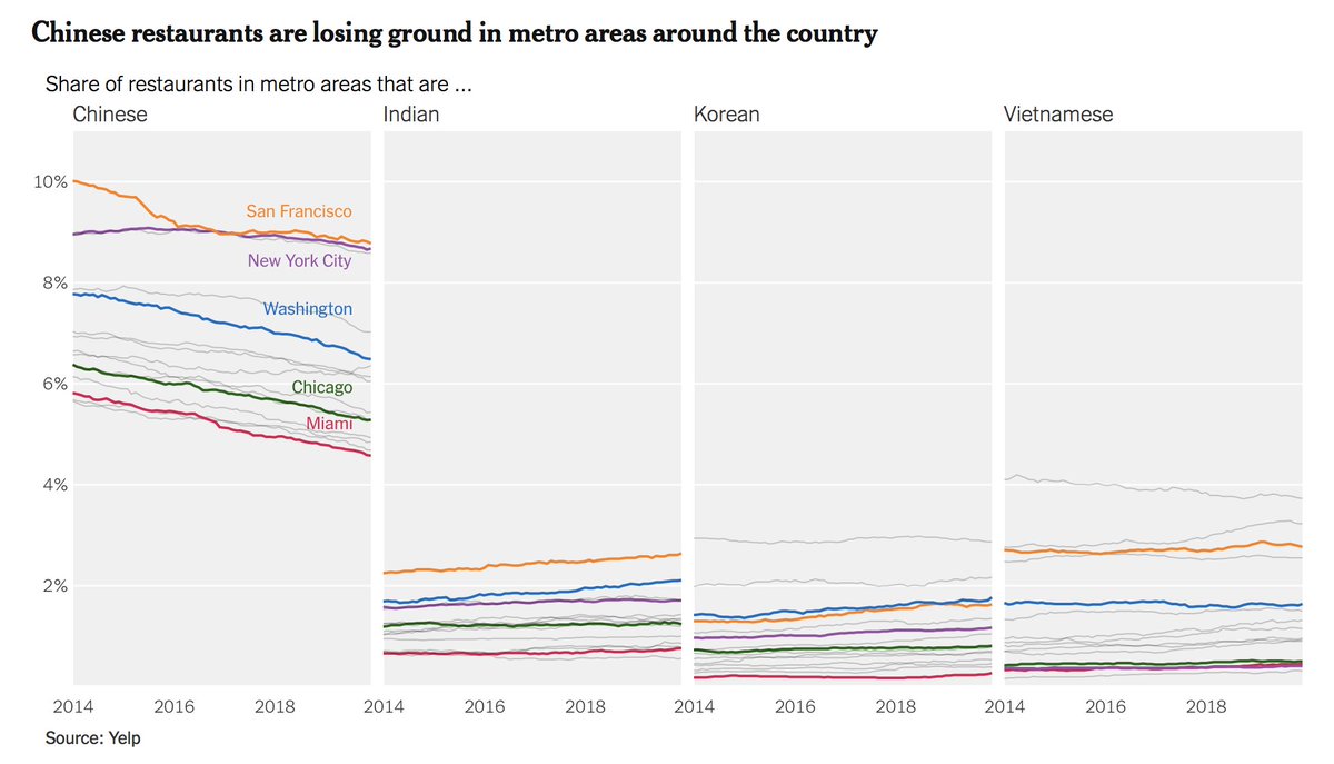 In the last 5 years, the % of Chinese restaurants in cities has dropped. Not from changing preferences. In fact, other Asian restaurants are trending up.