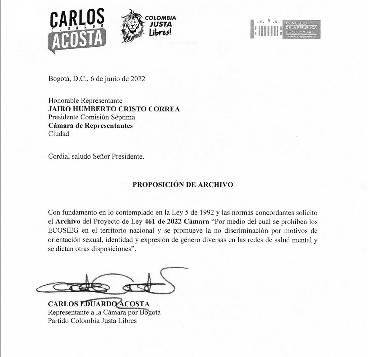 Nuestro compromiso con la vida, la libertad y la propiedad seguirá vigente hasta el final. Por tal motivo, radicamos proposición de archivo al PL #461 de 2022