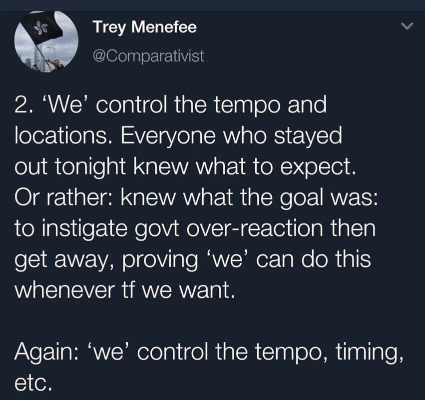 The aim of Hong Kong protesters: escalate, escalate, to trigger harsh gov over-reaction...pic.twitter.com/YeTzgkS9sY