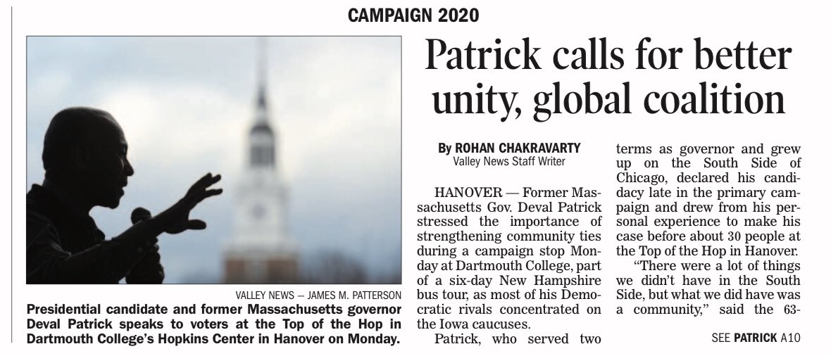 @DevalPatrick on the front page of@ConwayDailySun because he's been in New Hampshire all week long meeting voters and building support! Deval Patrick has the strongest record of results, & we are ready for#FITN PRIMARY!#DevalForAll#DevalAboard https://www.conwaydailysun.com/news/local/patrick-visits-kennett-high-senior-center/article_def6115e-46ce-11ea-8fd2-075c67f5f552.html …pic.twitter.com/HS09mSLI6E
