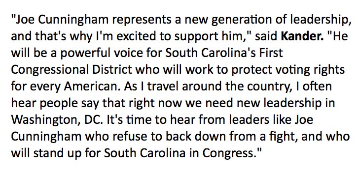 #SC01 is the second South Carolina Democrat that Jason Kander has endorsed. Kander, a prospective 2020 candidate, is wading into early state South Carolina politics.https://twitter.com/jslovegrove/status/979079339143778309 …