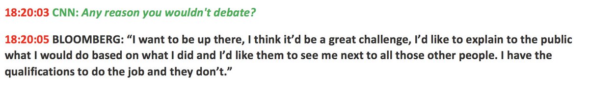 @MikeBloomberg if there is any reason he wouldn't take the debate stage if he were to qualify. "I want to be up there ... I have the qualifications to do the job and they don't," he said.pic.twitter.com/T6P59Bhh1u