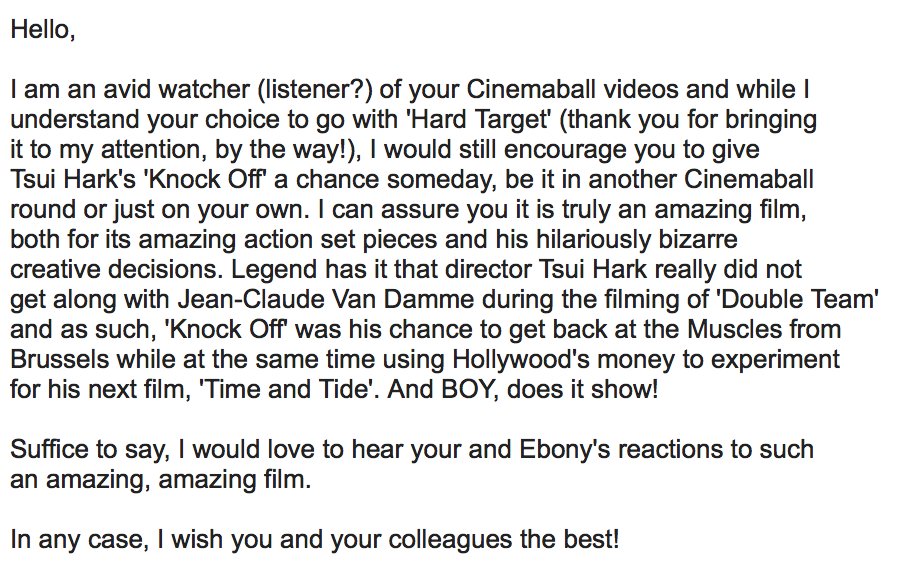 Our Cinemaball podcast may not have a vast number of listeners, but they sure are great ones! With @ebonyaster on defense, I failed to get the ball to the JCVD film Knock Off, so we never got around to watching it and discussing it. Just got this email about it from a listener.pic.twitter.com/iPUysplWN0