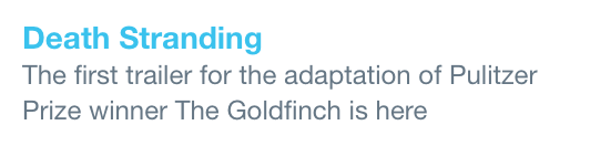 Oh, I didn't realize Death Stranding was an adaptation of The Goldfinch! Finally, the Donna Tartt-Hideo Kojima collabo I've been waiting for! I love that Kojima's taken the source material and really put his own distinctive stamp on it.pic.twitter.com/Tjt0GBaqAq