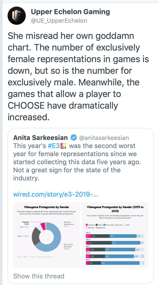 Yeah, we "misread our own chart," and definitely didn't "explain in the fucking article we wrote why games that allow choice, while welcome, are not qualitatively the same as games that require players to identify with a female protagonist."pic.twitter.com/DIw5njvstW