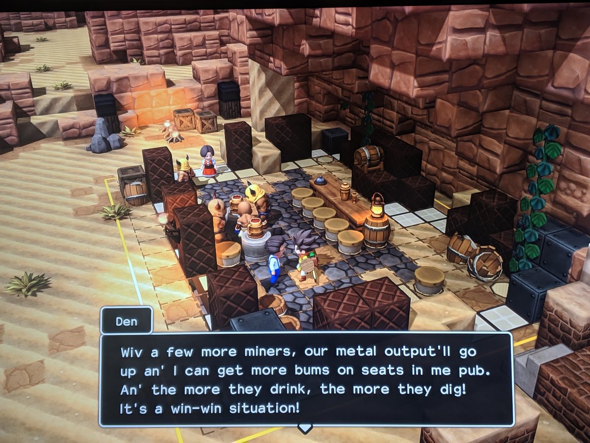 in Dragon Quest Builders 2 there's a whole bit where you're trying to motivate miners and the way to do it is to build a bar for them. dudes keep saying like "i'll mine more during the day if i know i can come here and drink my sadness away at night!"
