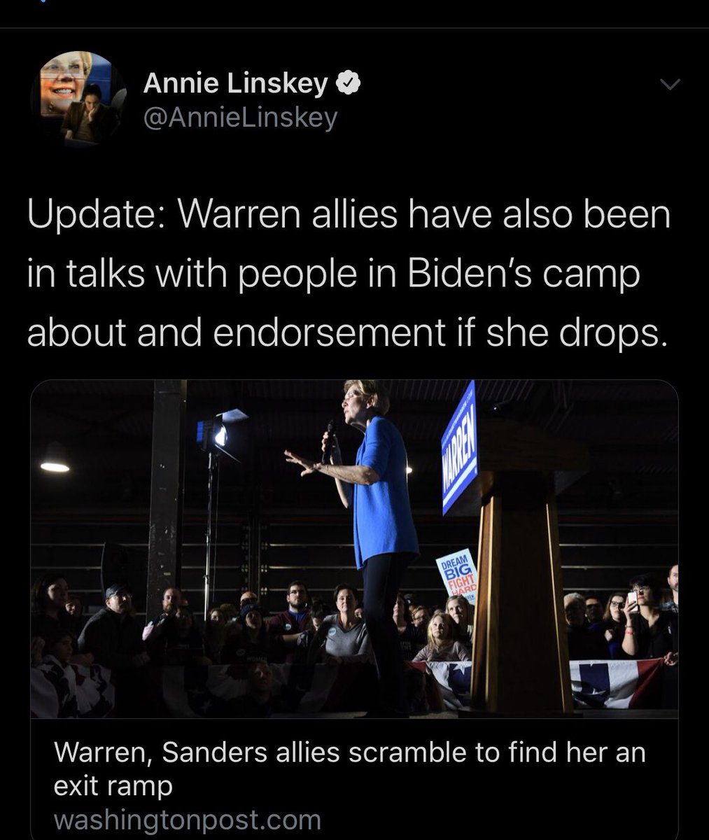 A good chunk of Warren voters could drift to Biden. It’ll be over once Biden wins big in Michigan, Florida and Georgia next week.pic.twitter.com/Qbi91IFkrt